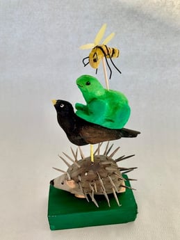 Wieder schnitzt du vier mutige Tiere, ein Igel, ein Frosch, eine Amsel und eine Biene.