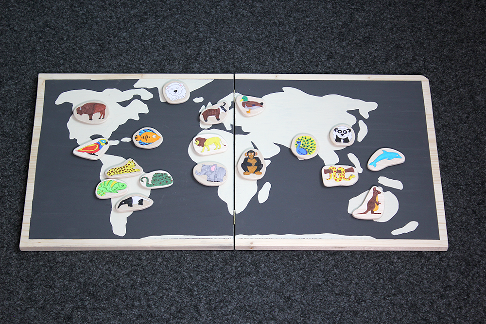 Und schon ist die magnetische Weltkarte fertig! Hier findest du die Bastelanleitung für Magnettiere. Mache möglichst viele davon, damit die Weltkarte schön voll wird!