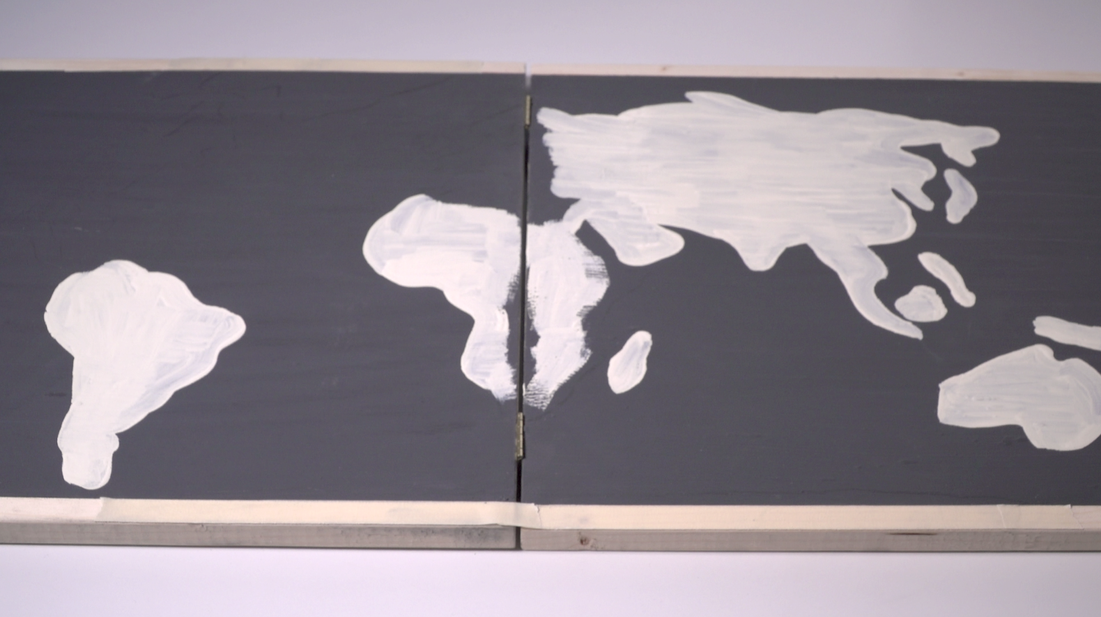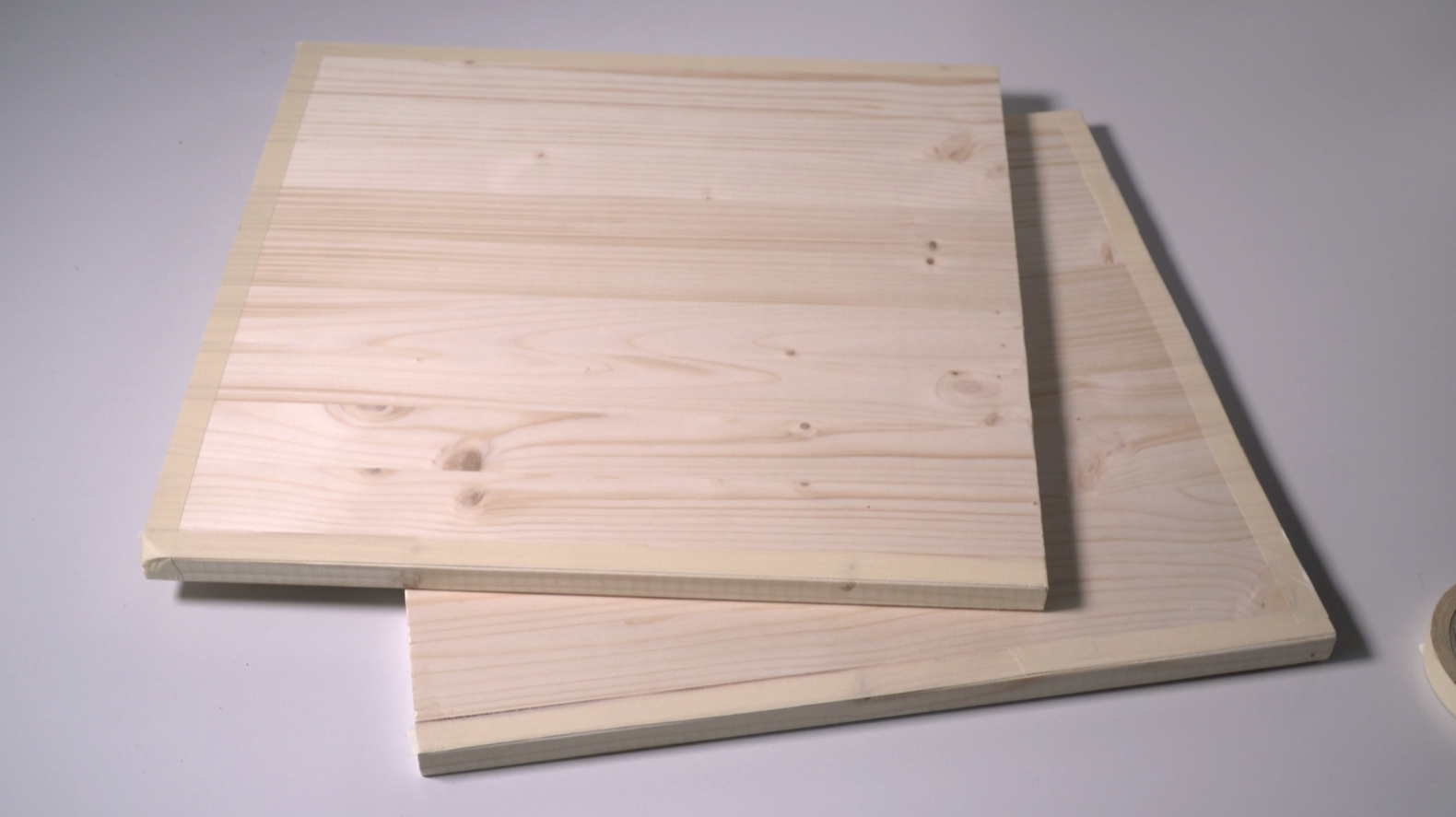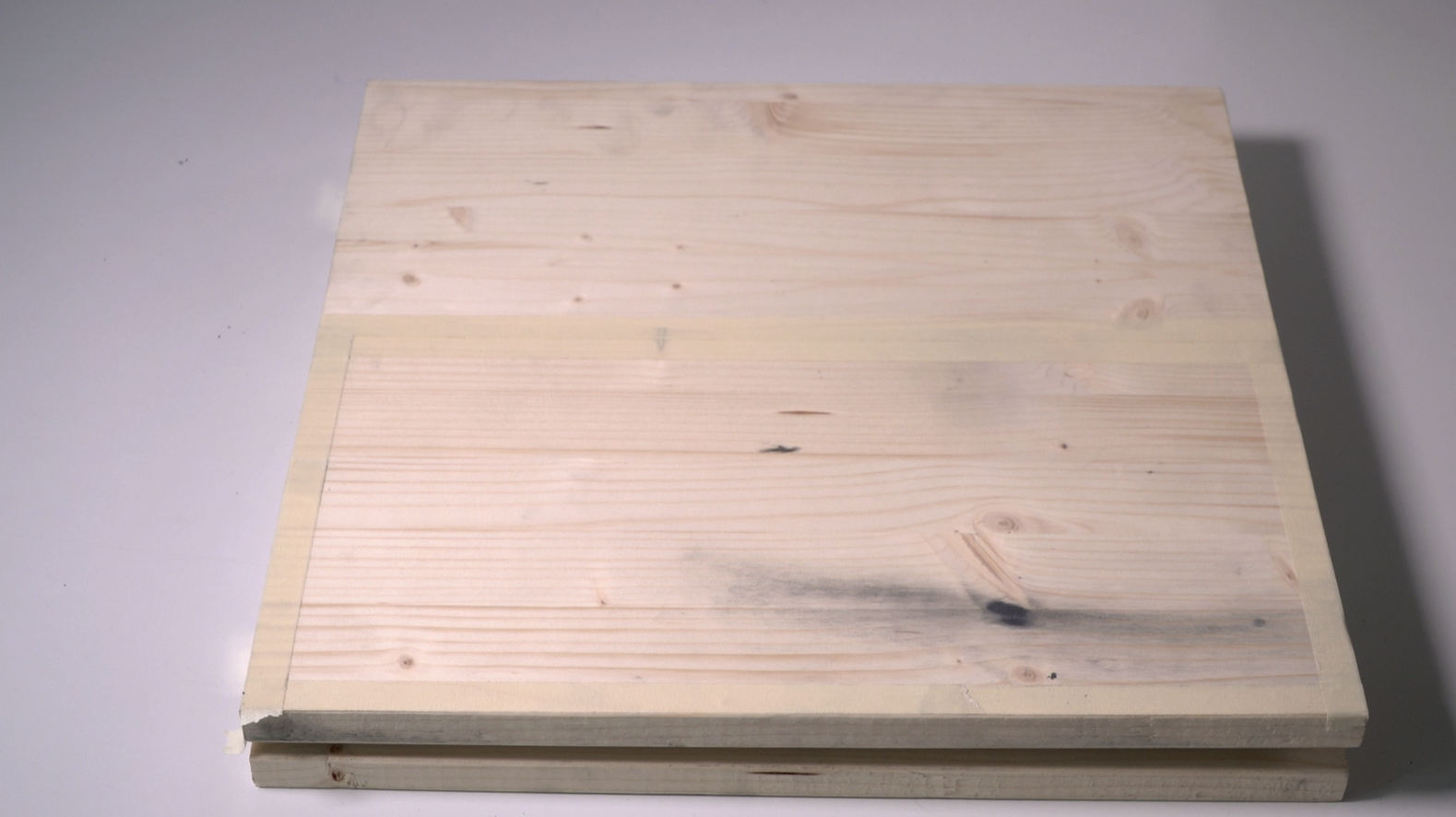 Du wirst die Weltkarte später wie ein Buch aufschlagen können. Lege die beiden Bretter vor dich und klebe den äusseren Rand mit Malerkrepp ab.