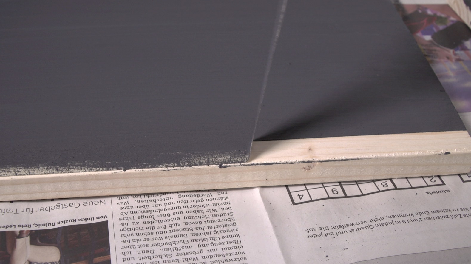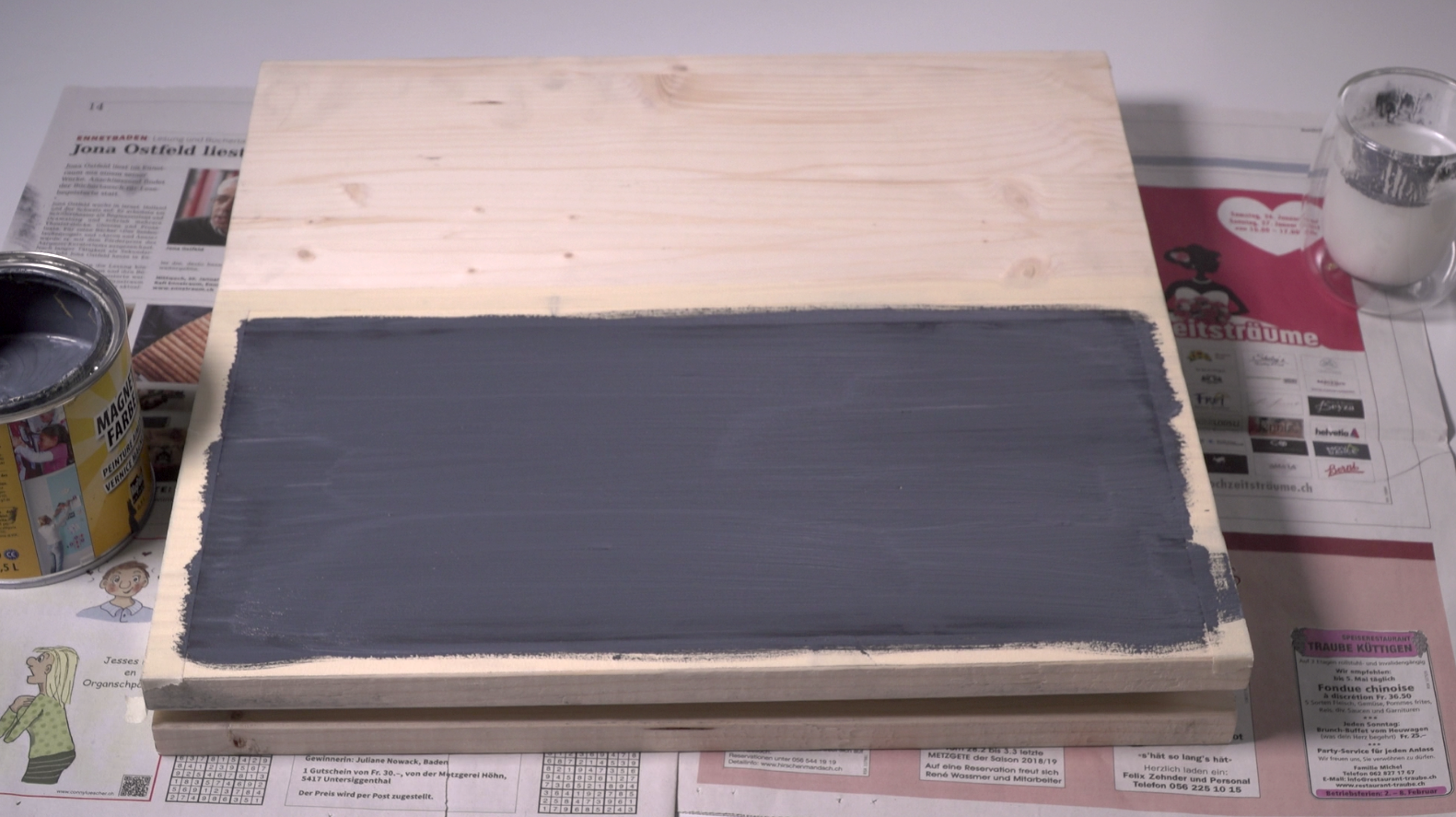 Rühre die Magnetfarbe gut auf und bestreiche die Vorderseiten der Holzbretter damit. Lasse sie etwas antrocknen und mache noch einen zweiten Anstrich. Verwende unbedingt eine Malunterlage, zum Beispiel eine alte Zeitung.