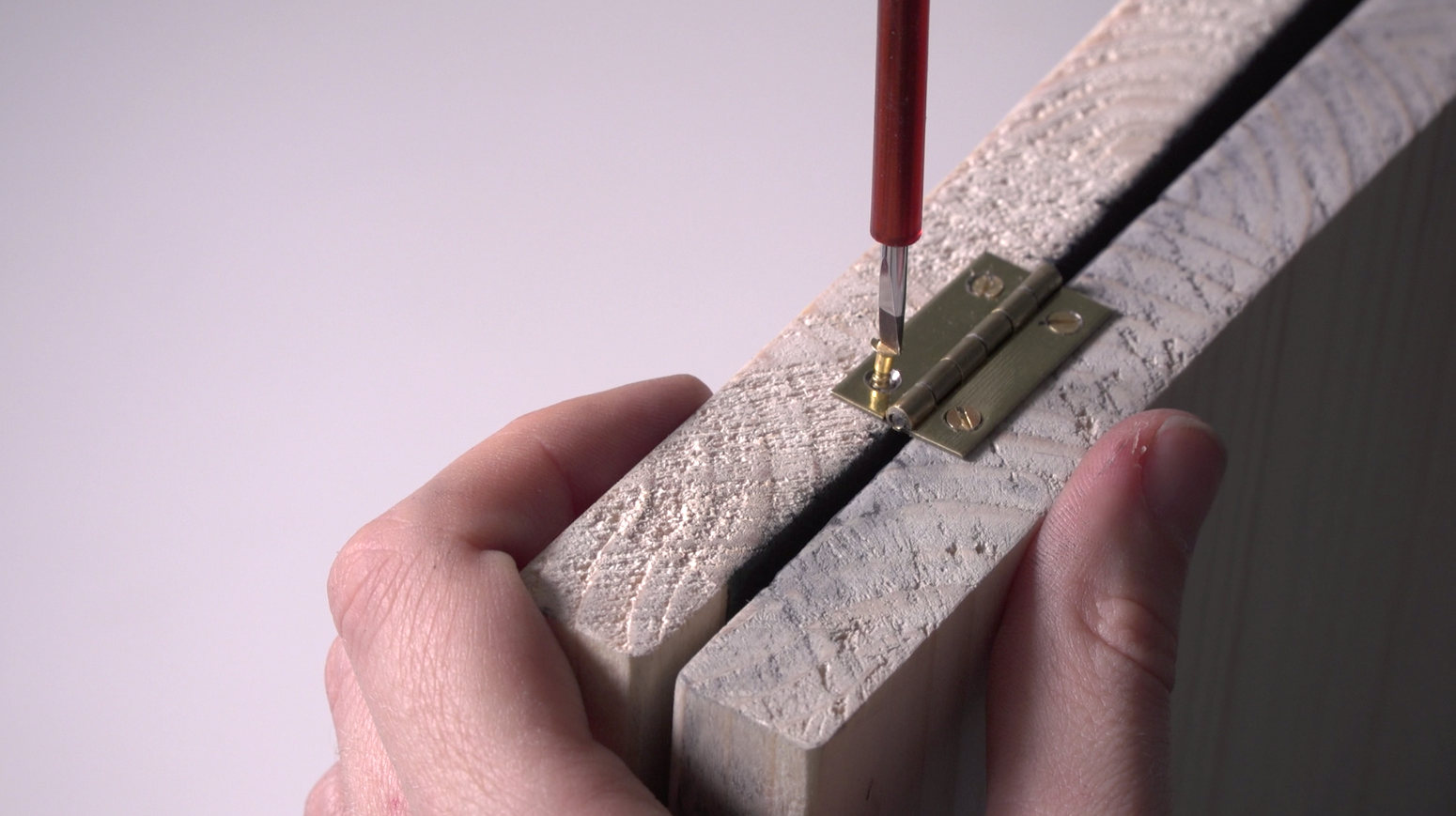 Schraube die zwei Scharniere zwischen die beiden Bretter, so dass man sie wie ein Buch zuklappen kann. Achte gut auf die Schliessrichtung!