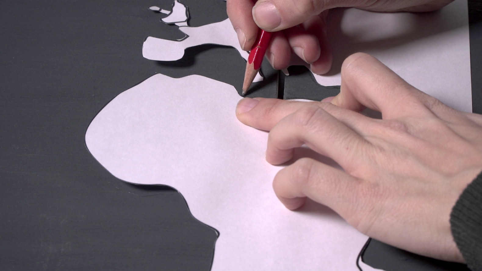 Klapp die Weltkarte wieder auf und zeichne mit einem weichen Bleistift die Kontinente auf.