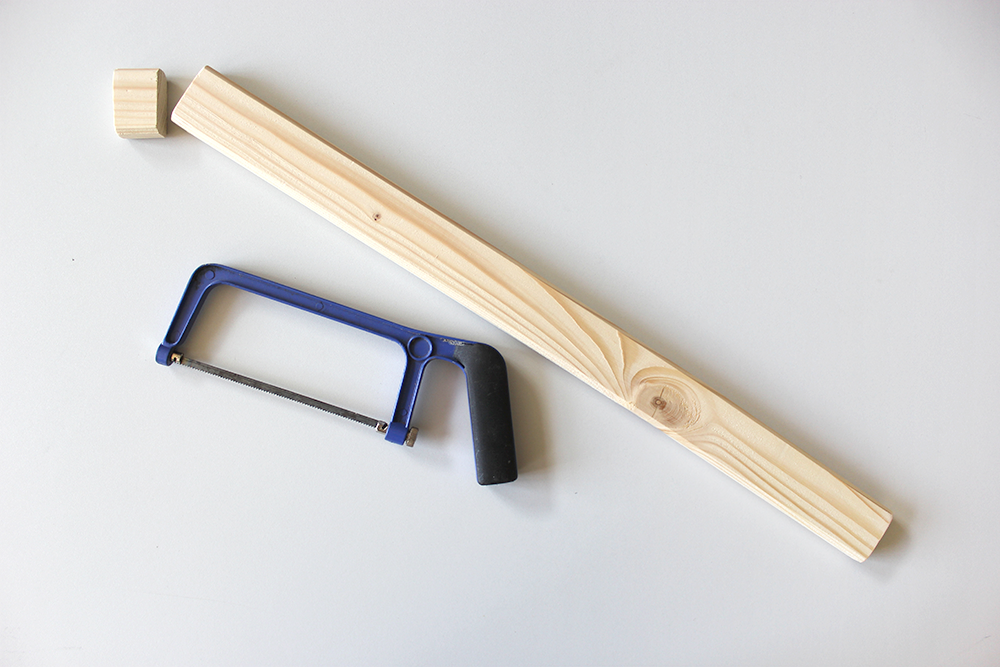 Von der Holzlatte sägt du ein 3 cm langes Stück ab. Dass wird später als Spannteil dafür sorgen, dass der Kistenbass noch besser klingt.