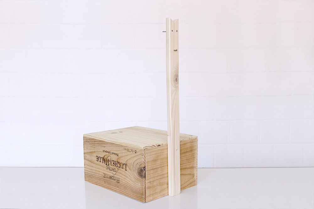 Befestige die Latte mit den vier Schrauben seitlich an der Kiste, so dass die beiden eingeschlagenen Nägel nach innen zeigen.
