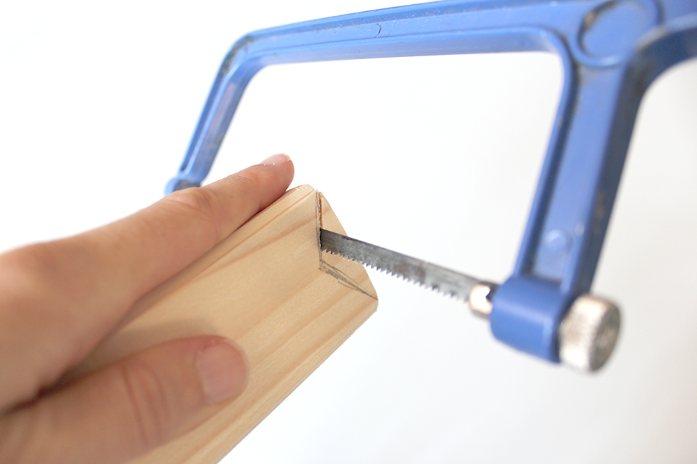 Dann kerbst du die Holzlatte oben tief ein. Sätze dafür die Säge jeweils links und rechts schräg an und säge bis zur Mitte. Mit dem Spannteil machst du dasselbe und sägst eine Kerbe hinein. Schleife danach wieder alles schön glatt, damit keine Holzsplitter mehr herausstehen.