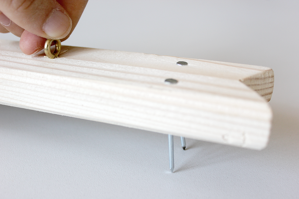 Jetzt misst du auf der Holzlatte 4 cm vom eingekerbten Ende ab. Dort schlägst du von hinten die zwei Nägel durch die Latte, bis sie auf der anderen Seite wieder herauskommen. Darauf wird später das Spannteil liegen.