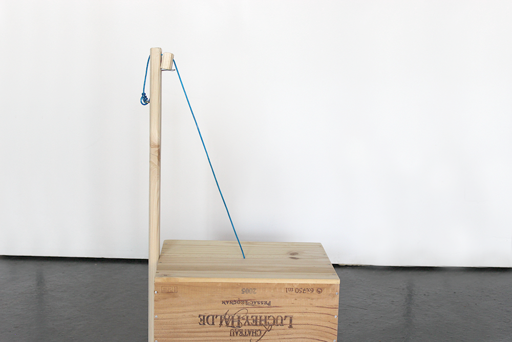 Jetzt ziehst du das Seil durch das Loch in der Kiste und verknotest es an der Innenseite, so dass es nicht mehr durchrutschen kann. Dann legst du das Spannteil auf die beiden Nägel und ziehst das Wäscheseil über die Latte, spannst es und machst es an der Ringschraube fest.