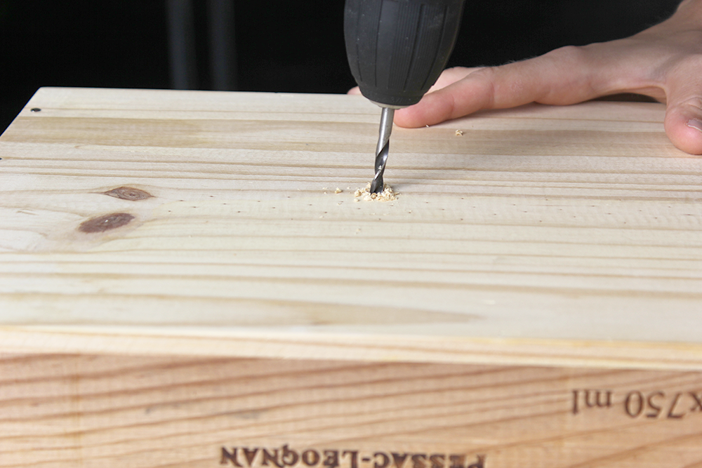 In die Mitte des Kistenbodens bohrst du ein Loch. Nimm dafür keinen allzu grossen Bohrer, nur gerade so, dass du nachher das Wäscheseil durchziehen kannst.